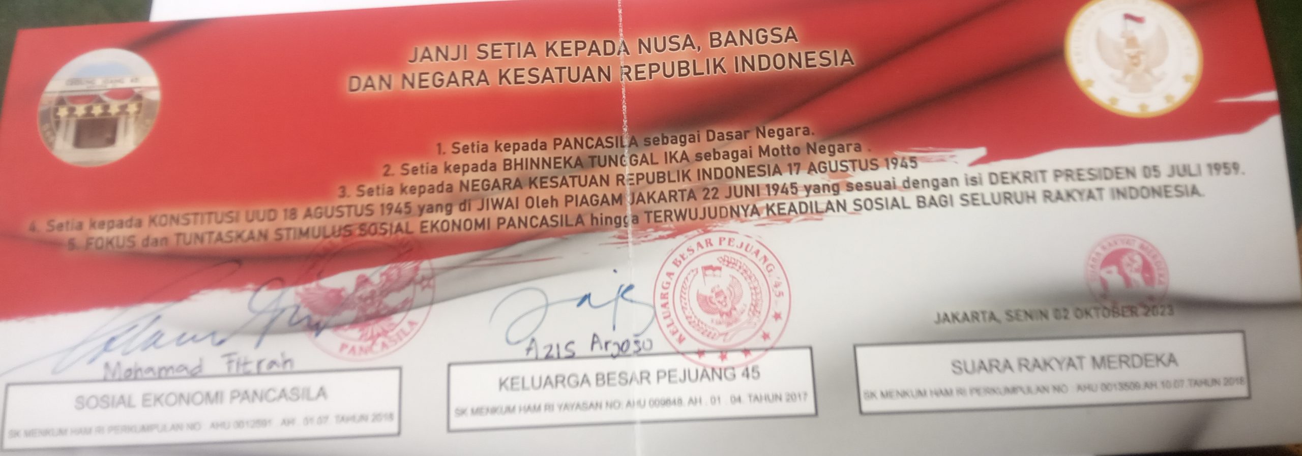 Terpantau, dari beberapa organisasi kemasyarakatan yang memiliki badan hukum/legalitas SK Menkumham menandatangani isi ikrar janji setia kepada Nusa, Bangsa dan Negara di jalan Amir Hamzah no.10 Kawasan Menteng, Jakarta pusat. Adapun organisasi kemasyarakatan tersebut diantara nya, Keluarga Besar Pejuang-45 (YKBP-45), Perkumpulan Sosial Ekonomi Pancasila (PSEP), Suara Rakyat Merdeka.