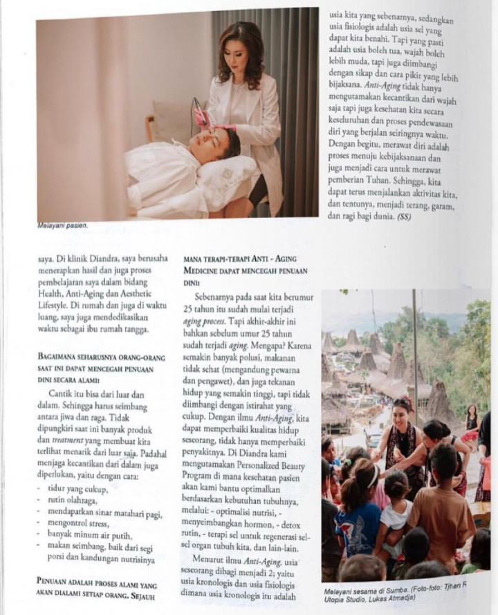“Di klinik Diandra, saya berusaha menerapkan hasil dan juga proses pembelajaran saya dalam bidang kesehatan. Karena, untuk Anti-Aging dan Aesthetic Lifestyle baik di rumah maupun di waktu luang, saya juga mendedikasikan waktu sebagai ibu rumah tangga,” ujar sosok ibu rumah tangga yang sangat menyanyangi keluarga nya ini.