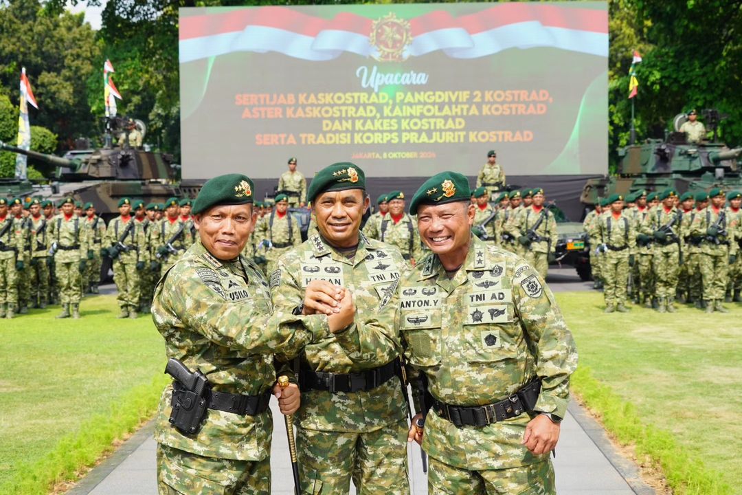 Panglima Kostrad (Pangkostrad) Letnan Jenderal TNI Mohamad Hasan memimpin langsung upacara serah terima jabatan (Sertijab) Panglima Divisi Infanteri 2 Kostrad, dari Mayjen TNI Anton Yuliantoro, S.I.P., M.Tr.(Han)., kepada Mayjen TNI Susilo, yang berlangsung di Lapangan Upacara Markas Kostrad, Gambir, Jakarta Pusat, Selasa (08/10/2024).