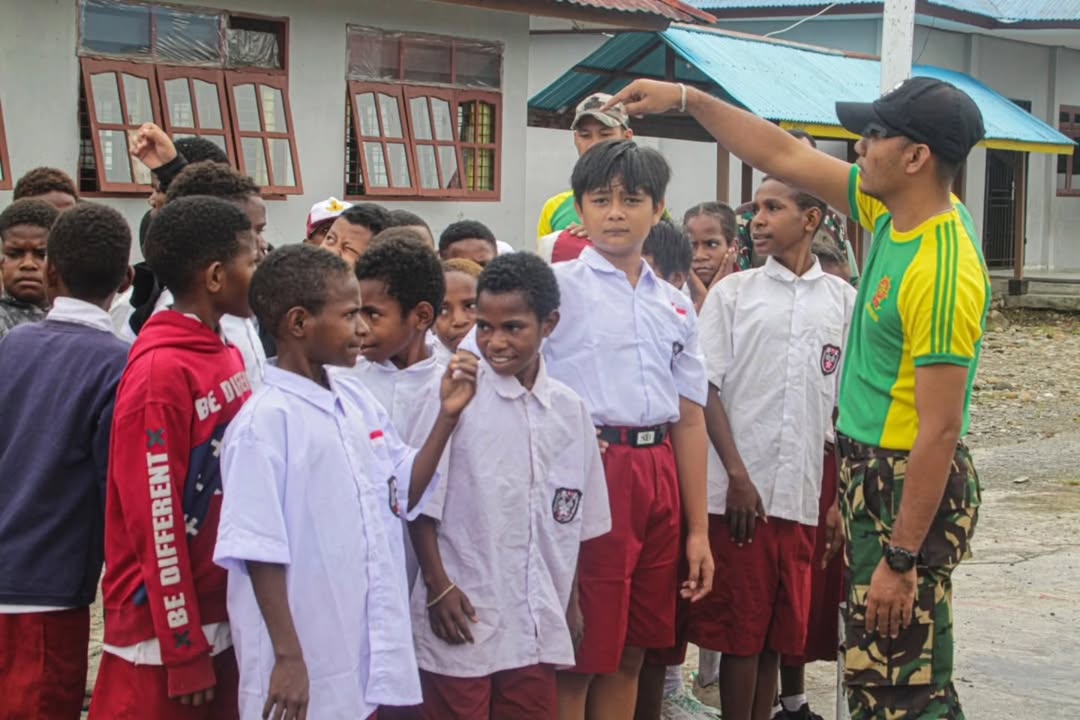 Papua – Satgas Pamtas Mobile RI-PNG Yonif 503 Kostrad ajak anak – anak SD Inpres mengawali pelajaran dengan berolahraga sepak bola bersama di lapangan sekolah SD Inpres, Distrik Kenyam, Kabupaten Nduga. Papua. Selasa (04/02/2025).