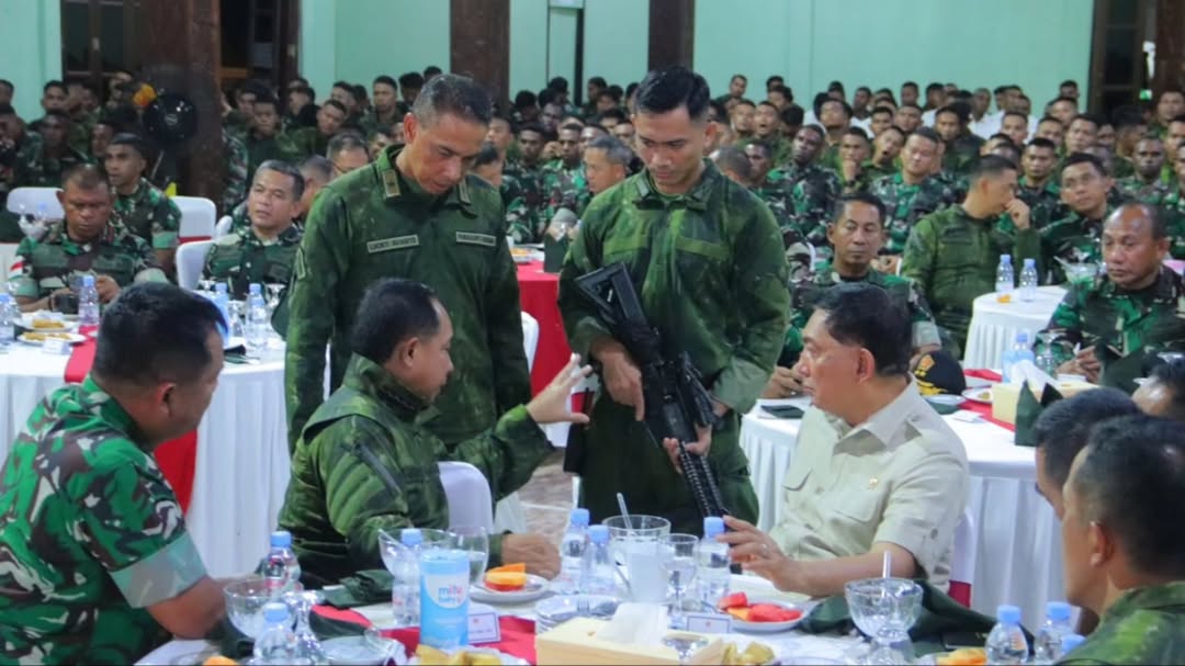 Didampingi oleh Panglima TNI dan jajaran, Menhan RI menyapa langsung prajurit di Aula Mako Yonif 754/ENK. Suasana haru dan penuh semangat terasa ketika Menteri Pertahanan menyampaikan pesan-pesan motivasi kepada para prajurit yang tetap bertugas dengan penuh dedikasi meskipun jauh dari keluarga.