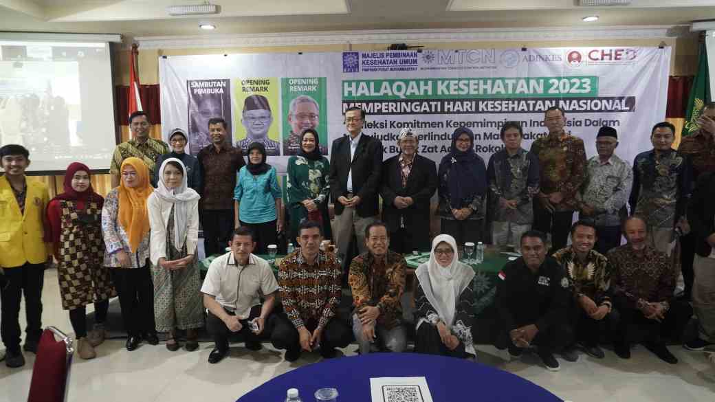 Momen Hari Kesehatan Nasional (HKN) 2023 ini MPKU (Majelis Pembina Kesehatan Umum) PP Muhammadiyah melalui MTCN (Muhammadiyah Tobacco Control Network) menggelar Halaqoh Kesehatan yang bekerja sama dengan ADINKES (Asosiasi Dinas Kesehatan) Nasional. Kegiatan ini menjadi wujud dukungan pembentukan regulasi pengendalian tembakau yang lebih kuat dan komprehensif, sebagaimana dalam waktu dekat ini penyusunan RPP Kesehatan khususnya pasal tentang zat adiktif rokok membutuhkan dukungan semua pihak. Muhammadiyah, dengan jejaring pengendalian tembakau di Internal maupun di Indonesia melakukan berbagai pendekatan kajian dan advokasi dan terus mendorong pemerintah untuk menyusun regulasi pengendalian tembakau yang optimal. Halaqoh Kesehatan, yang diselenggarakan dalam bentuk webinar, diinisiasi sebagai wujud dukungan kepada para pemangku kebijakan di tingkat eksekutif yang saat ini tengah menyusun Pasal Zat Adiktif dalam RPP Kesehatan.
