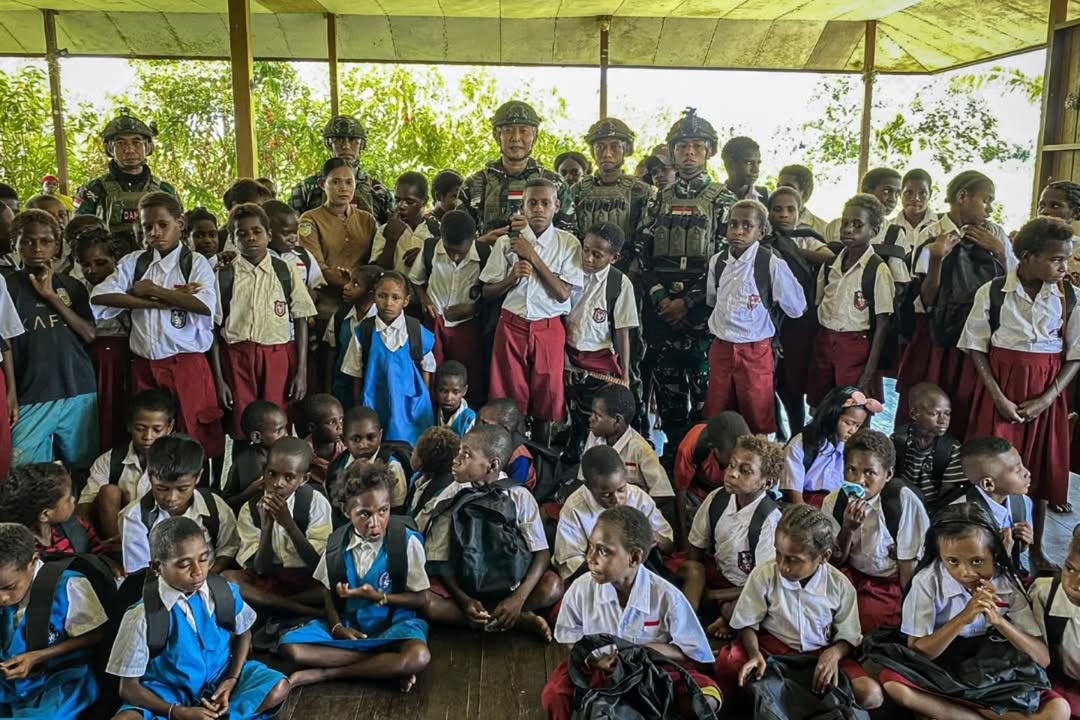 Satgas Pamtas Mobile RI-PNG Yonif 503 Kostrad bagikan ratusan paket tas sekolah bagi anak – anak SD dan TK di Distrik Krepkuri, Kabupaten Nduga Papua. Senin (24/02/2025).