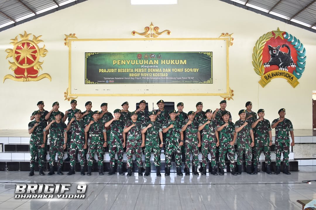 Prajurit dan Persit Denma Brigif 9/DY/2 Kostrad dan Yonif 509/BY/9/2 Kostrad menerima Penyuluhan Hukum dari Pakum Divisi Infanteri 2 Kostrad, Mayor Chk Ahmad Syaekhoni, S.I.P., S.H. Beserta Tim Serma Dodi dan Sertu Andrija selaku pemateri yang di dampingi langsung oleh Danbrigif 9/DY/2 Kostrad Kolonel Inf Dr. La Ode Muhammad Nurdin, S.Sos., M.I.Pol. yang bertempat di GSG(Gudang Serba Guna) Yonif 509/BY/9/2 Kostrad, Selasa(11/03/2025).