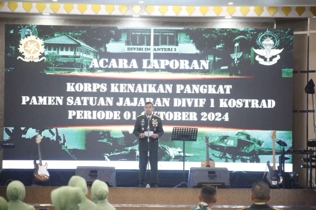 Panglima Divisi Infanteri (Pangdivif) 1 Kostrad Mayjen TNI Novi Rubadi Sugito, S.I.P., M.Si., menerima laporan kenaikan pangkat Perwira Menengah (Pamen) Divif 1 Kostrad bertempat di Markas Divisi Infanteri 1 Kostrad (Madivif) Cilodong, Depok, Selasa (1/10/2024).