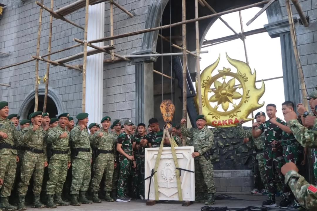 Gowa – Panglima Divisi Infanteri 3 Kostrad, Mayjen TNI Bangun Nawoko, memimpin pemasangan lambang satuan di Gerbang Kemenangan Divif 3 Kostrad yang berlokasi di Mako Divif 3 Kostrad, Pakatto, Sulawesi Selatan. Jumat (03/01/2025).