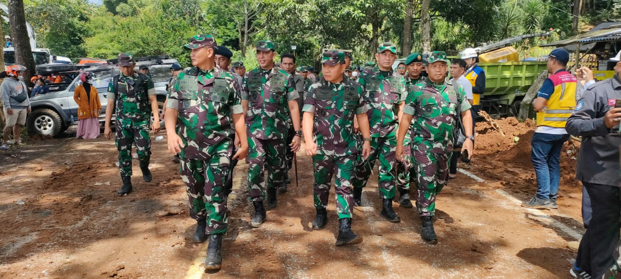 Kasad Jenderal TNI Dr. Dudung Abdurachman juga meninjau daerah pusat gempa sekaligus paling parah terdampak gempa yaitu Kecamatan Cugenang-Cianjur yang mengalami longsor parah dan sebagian jalan raya jalur utama Cianjur-Puncak teputus.