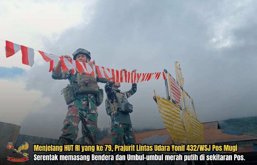 MetropolitanPost.id – Menjelang HUT – RI yang ke 79, Prajurit Lintas Udara 432 Pos Mugi menggelar pemasangan bendera dan umbul-umbul dalam memeriahkan Semarak HUT RI Yang Ke 79 di Distrik Mugi, Kabupaten Nduga, Papua Pegunungan. Senin (12/08/2024).