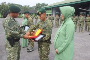 Di akhir upacara pelepasan, Danyonkav memberikan piagam penghargaan dan melaksanakan sesi foto bersama dengan prajurit yang akan pindah satuan. (Penkostrad).