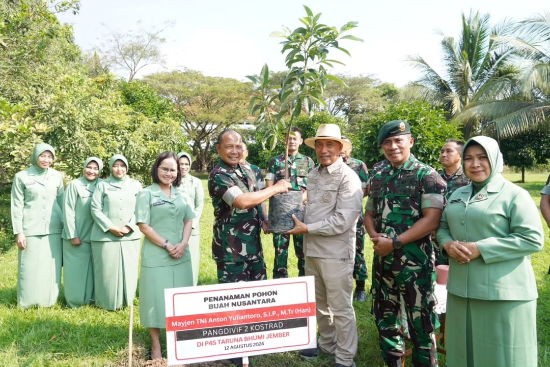 MetropolitanPost.id – Dalam rangka memperingati Hari Pramuka Ke-63, Panglima Divisi Infanteri 2 Kostrad Mayjen TNI Anton Yuliantoro, S.I.P., M.Tr.(Han)., beserta ibu dan para Asisten Kasdivif 2 Kostrad bersama bapak H. Arum Sabil yang dikenal sebagai Ketua Dewan Pembina Asosiasi Petani Tebu Rakyat Indonesia (APTRI) sekaligus Ketua Kwartir Cabang Pramuka Wilayah Jawa Timur, melaksanakan penanaman pohon jenis Alpukat nusantara yang dilaksanakan di Pusat Pelatihan Pertanian Jember, Jawa Timur. Senin (12/8/2024).