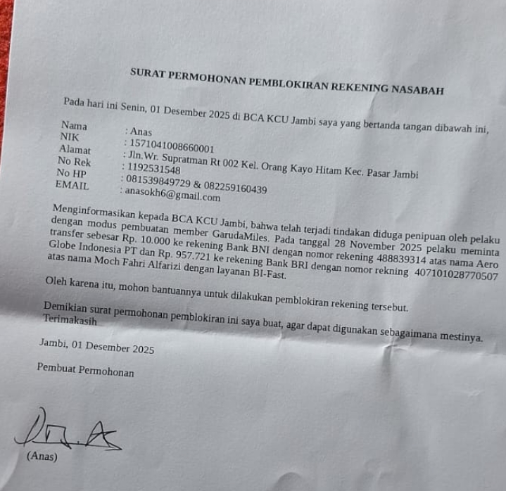 METROPOLITAN POST– Pada tanggal 1 Desember 2025, Bapak Anas, seorang nasabah BCA KCU Jambi, telah mengajukan surat permohonan pemblokiran terhadap dua rekening bank yang diduga terkait dengan tindakan penipuan bermodus pembuatan member GarudaMiles.