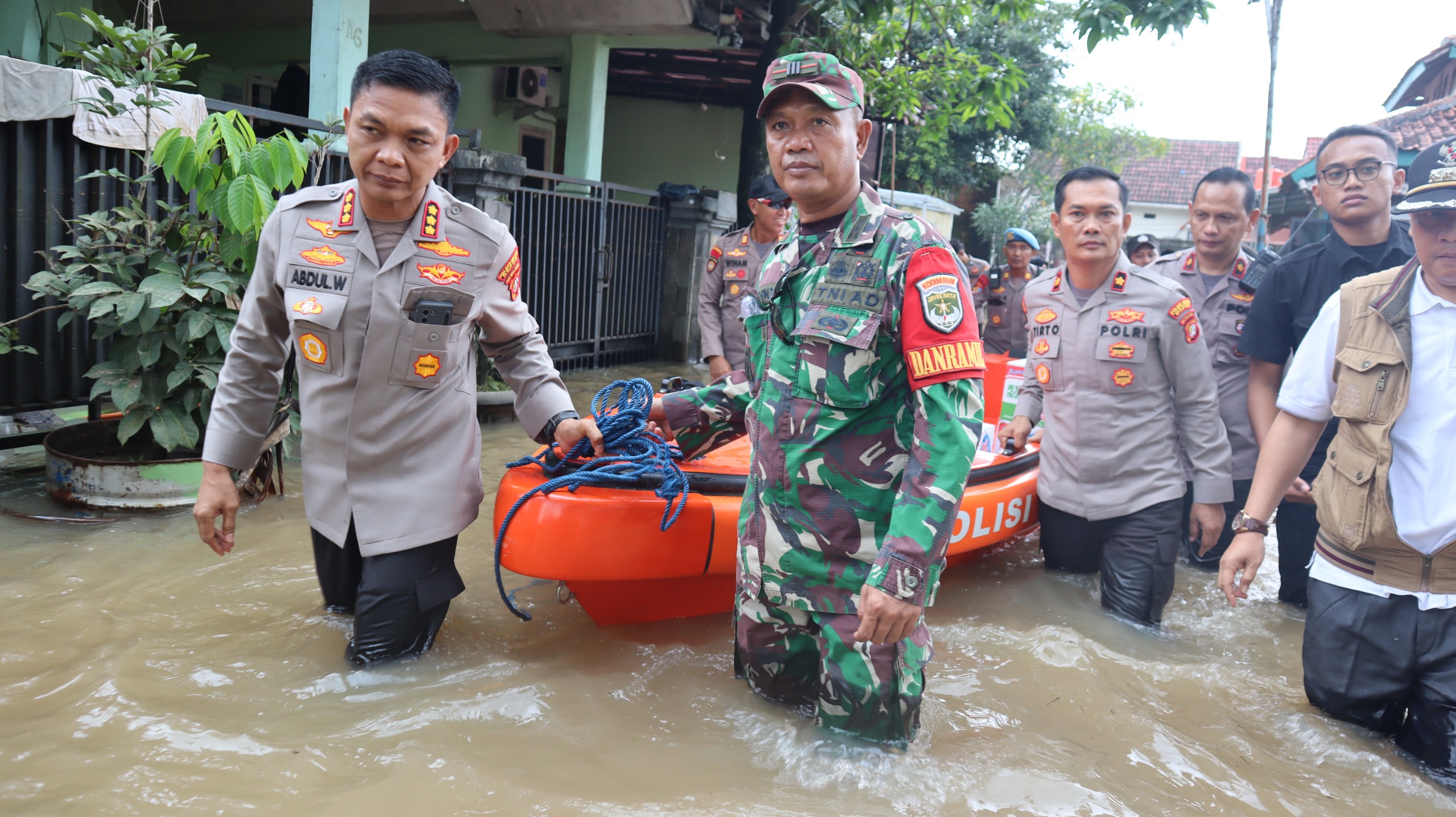 Kapolres Metro Depok Kombes Pol Abdul Waras bersama jajaran dan unsur TNI meninjau langsung kondisi banjir di Kelurahan Sawangan Baru, Kecamatan Bojongsari.