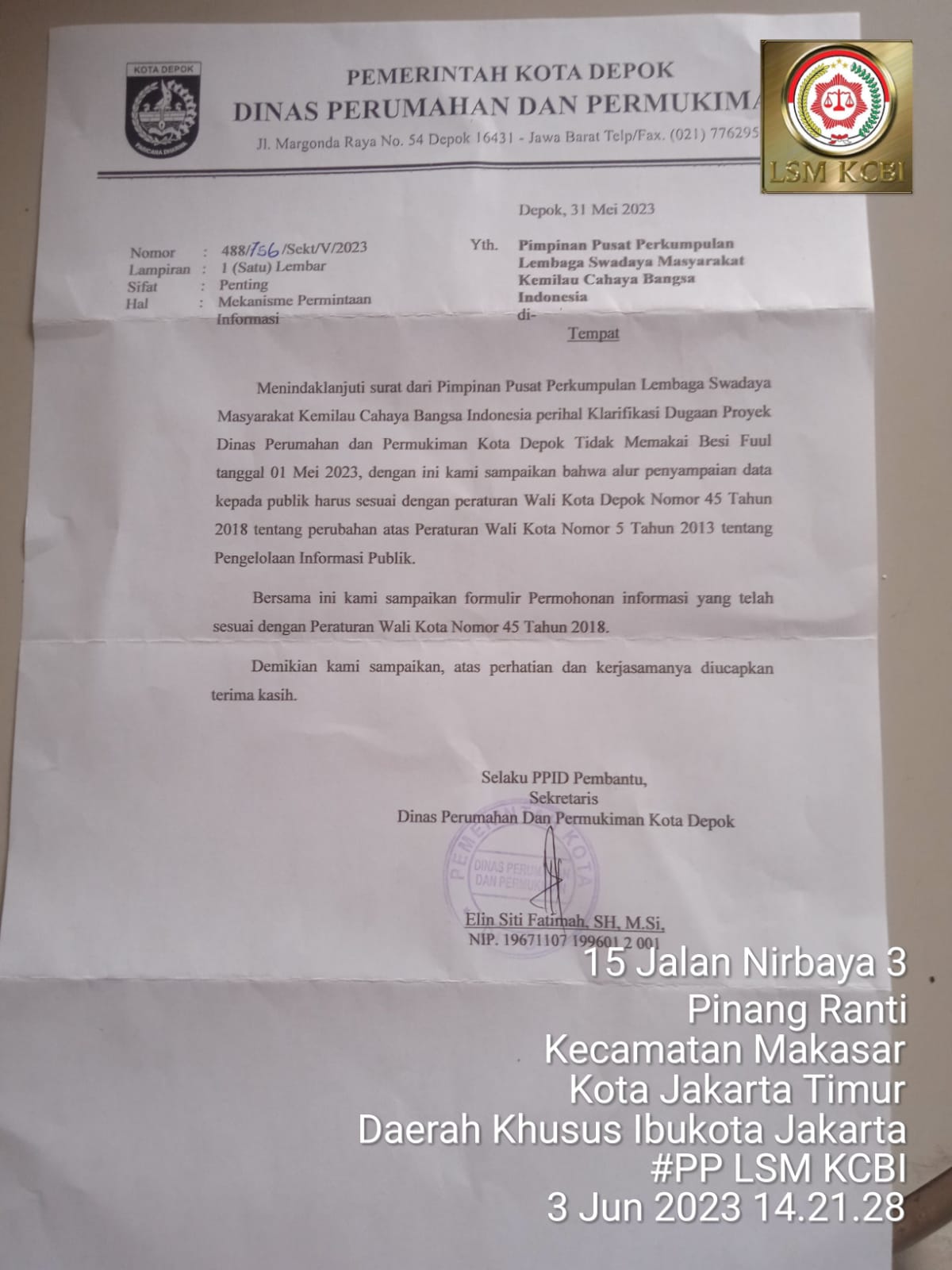 Dinas Perumahan dan Pemukiman Kota Depok telah menjawab surat klarifikasi PP Perkumpulan LSM KCBI dengan isi jawaban, menindaklanjuti surat dari Pimpinan Pusat Perkumpulan LSM Kemilau Cahaya Bangsa Indonesia (KCBI) perihal Klarifikasi Dugaan Proyek Dinas Perumahan dan Pemukiman Kota Depok tidak Memakai Besi Fuul tanggal 1 Mei 2023, dengan ini kami sampaikan bahwa alur penyampaian data kepada publik harus sesuai dengan peraturan Walikota Depok Nomor 45 Tahun 2018 tentang perubahan atas Peraturan Wali Kota Nomor 5 Tahun 2013 tentang Pengelolaan Informasi Publik.