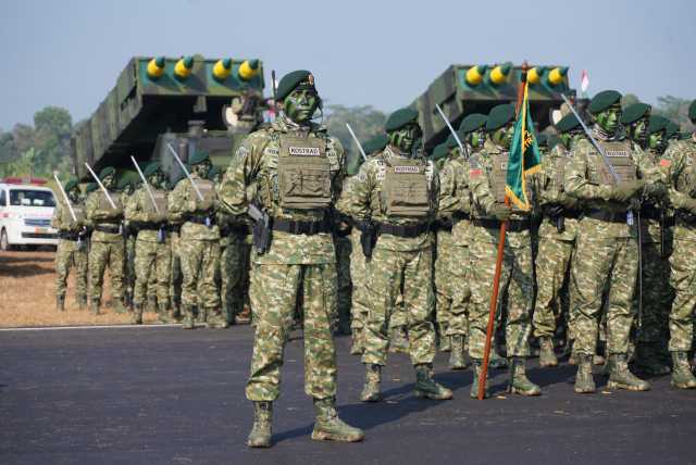 Usai upacara, kegiatan dilanjutkan dengan demo gabungan tiga matra TNI dan Defile pasukan. (Penkostrad).