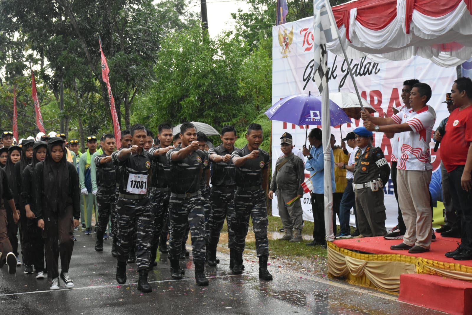 Meskipun diguyur hujan, namun tidak membuat Peserta Gerak Jalan Tri Lomba Juang HUT Ke-79 Kemerdekaan RI di Bintan, Kepulauan Riau patah semangat untuk memulai start. Bupati Bintan Roby Kurniawan mengatakan sangat berterimakasih kepada seluruh peserta gerak jalan yang tampil semangat meski cuaca hujan. “Meski hujan mereka tetap antusias dan tetap semangat, kami juga berpesan agar tetap tertib saat jalan menuju garis finis,” ujar Roby Kurniawan.