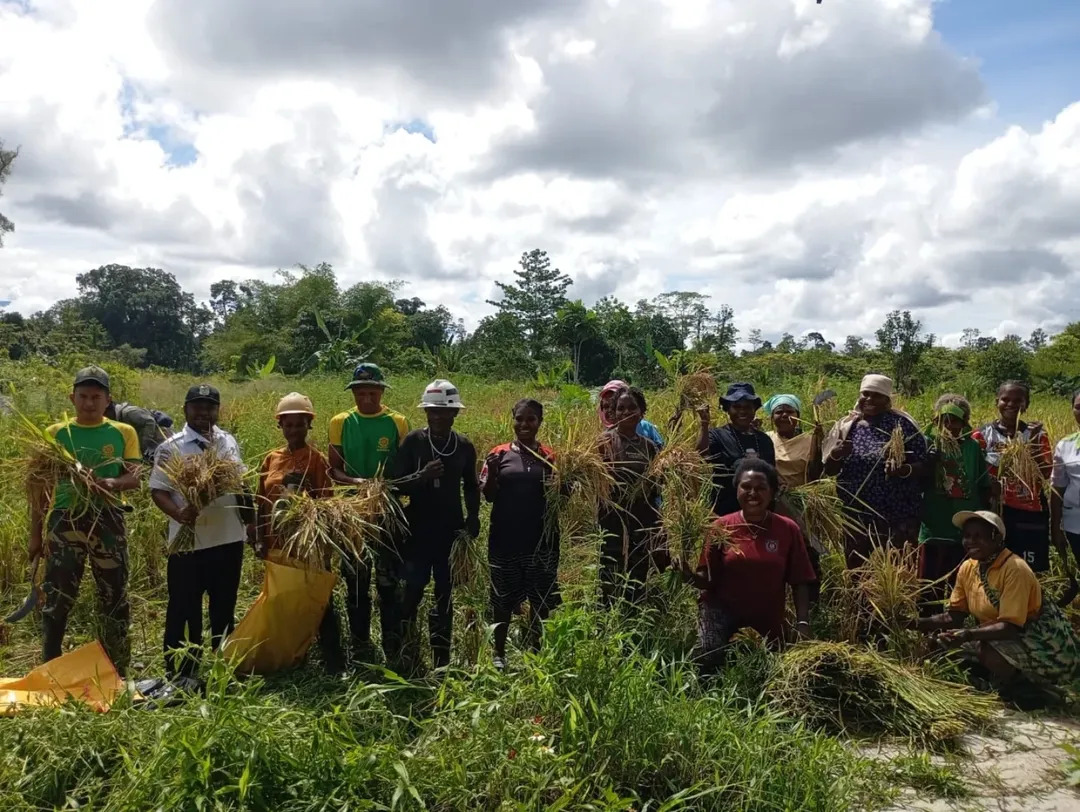 Kampung Mimika Gunung dikenal sebagai salah satu wilayah yang menjunjung tinggi kebersamaan, dan memiliki ikatan emosional yang kuat dengan para prajurit Yonif 754, yang dikenal dengan sebutan Prajurit Raja. Di tengah panas terik dan hamparan sawah, prajurit berseragam loreng tampak bahu membahu memanen padi bersama warga, membuktikan bahwa mereka tak hanya sigap di medan pertempuran, tapi juga hadir dalam denyut kehidupan masyarakat.