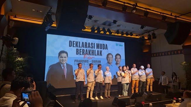 Ratusan anggota loyalis Erick Thohir yang tergabung dalam Relawan Muda BerAkhlak mendeklarasikan dukungan kepada calon presiden nomor urut 2 Prabowo Subianto dalam Pemilu Presiden dan Wakil Presiden (Pilpres) 2024.