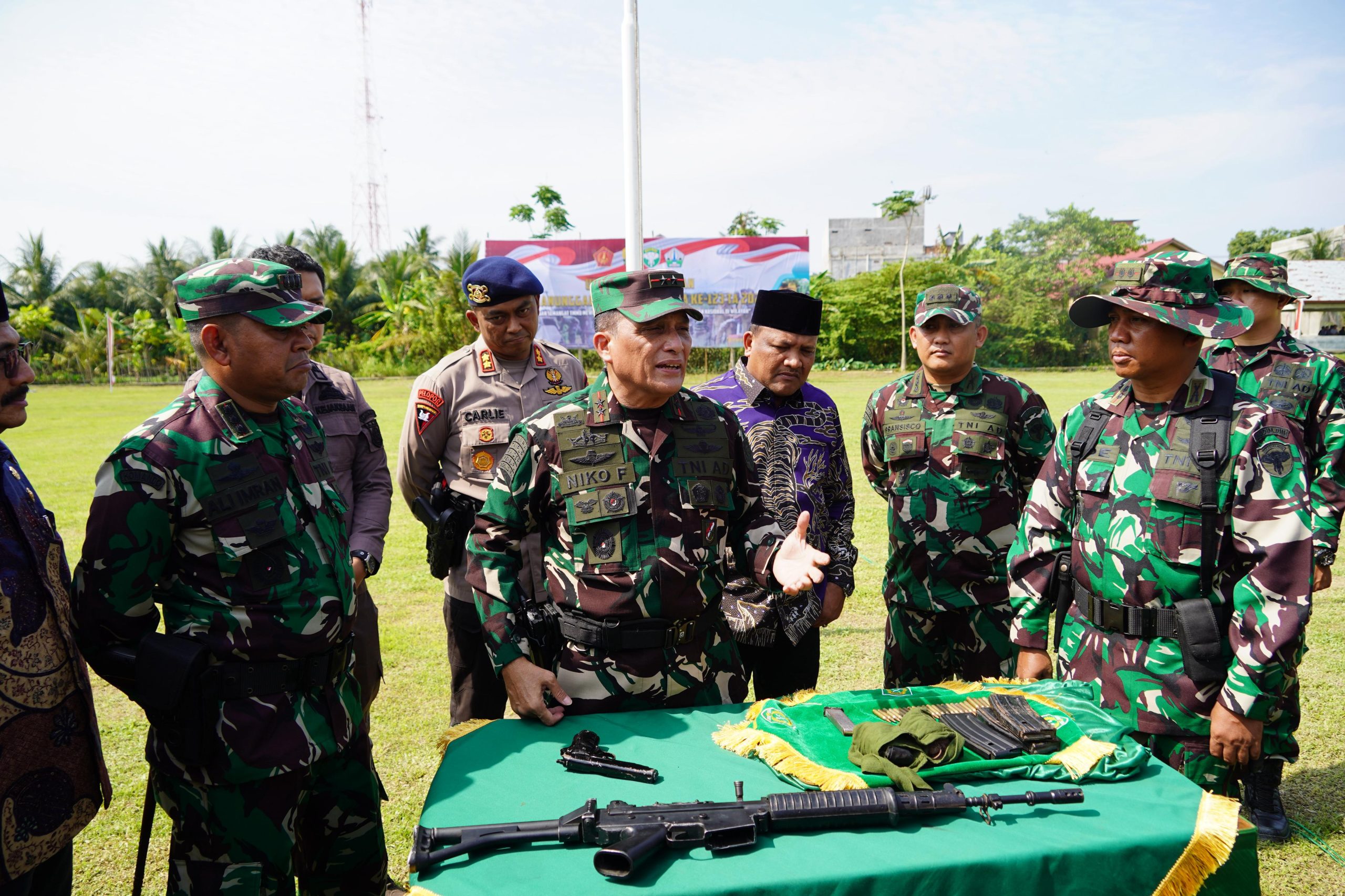 BIREUEN, tniad.mil.id – Panglima Komando Daerah Militer Iskandar Muda (Pangdam IM), Mayor Jenderal TNI Niko Fahrizal, M.Tr.(Han), menerima dua pucuk senjata api beserta amunisi dan granat sisa konflik dari Komandan Satuan Tugas (Dansatgas) TNI Manunggal Membangun Desa (TMMD) ke-123, Letkol Inf Ade Munandar, S.I.Pem., yang juga menjabat sebagai Komandan Kodim (Dandim) 0111/Bireuen. Penyerahan ini dilakukan di Lapangan Bola Kaki Desa Meunasah Pulo, Kecamatan Peudada, Kabupaten Bireuen, usai secara resmi menutup kegiatan TMMD ke-123 Tahun Anggaran 2025, Kamis (19/3/2025).