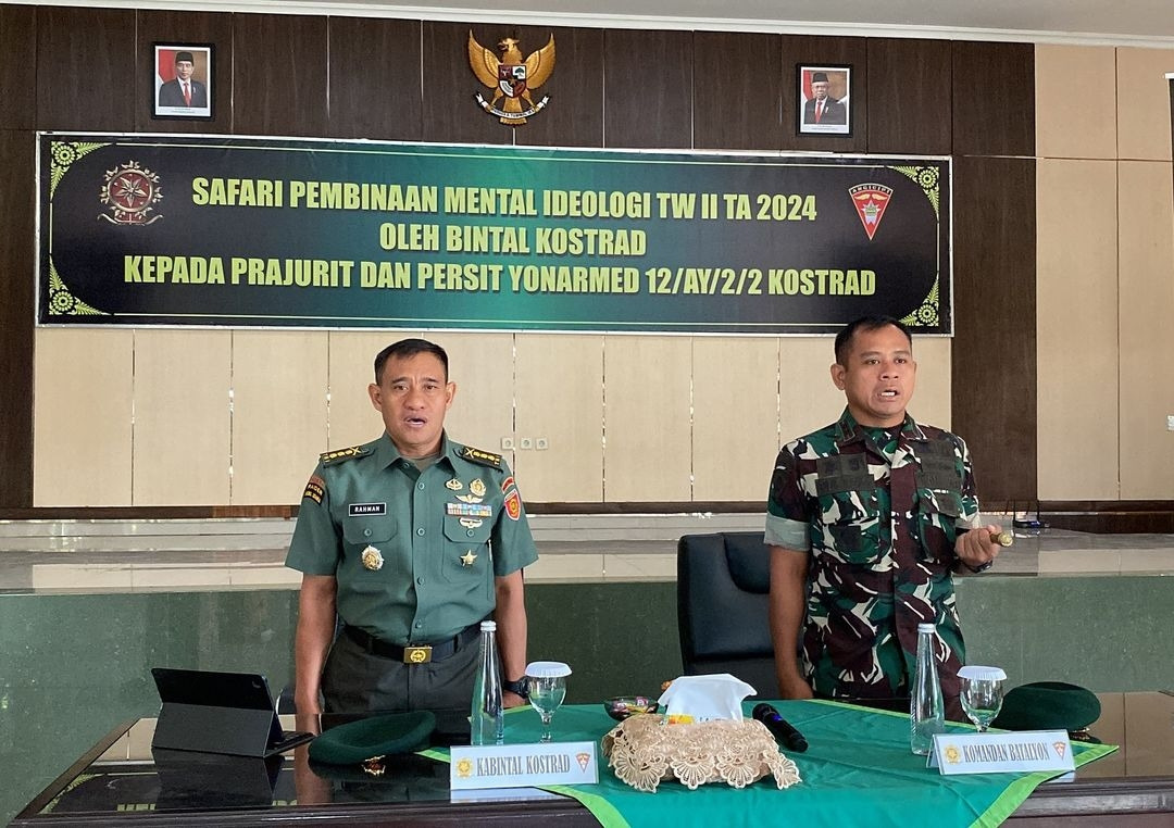 MetropolitanPost.id – Yonarmed 12 Kostrad terima kunjungan Kabintal Kostrad Kolonel Inf Rahman, S.Ag., M.Si., dalam rangka kegiatan penyuluhan pembinaan mental (Bintal) bagi seluruh prajurit dan anggota Persit Kartika Chandra Kirana (KCK) Ranting 4 Yonarmed 12 Kostrad. Kegiatan ini dilaksanakan di Aula Angicipi Mako Yonarmed 12 Kostrad. Ngawi, Jawa Timur. Senin (03/06/2024)