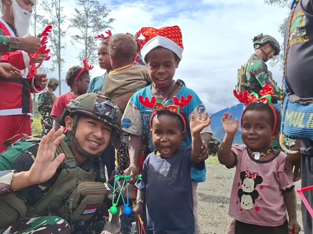 Dalam rangka menyambut hari raya Natal dan tahun baru 2025, prajurit Titik Kuat Pintu Jawa Satgas Pamtas Mobile RI-PNG Yonif 323/Buaya Putih melaksanakan kegiatan berbagi kepada masyarakat yang ada di sekitaran Titik Kuat Pintu Jawa. Adapun barang yang dibagikan yaitu topi santa, bando rusa, mainan anak-anak dan kado natal. (Penkostrad).