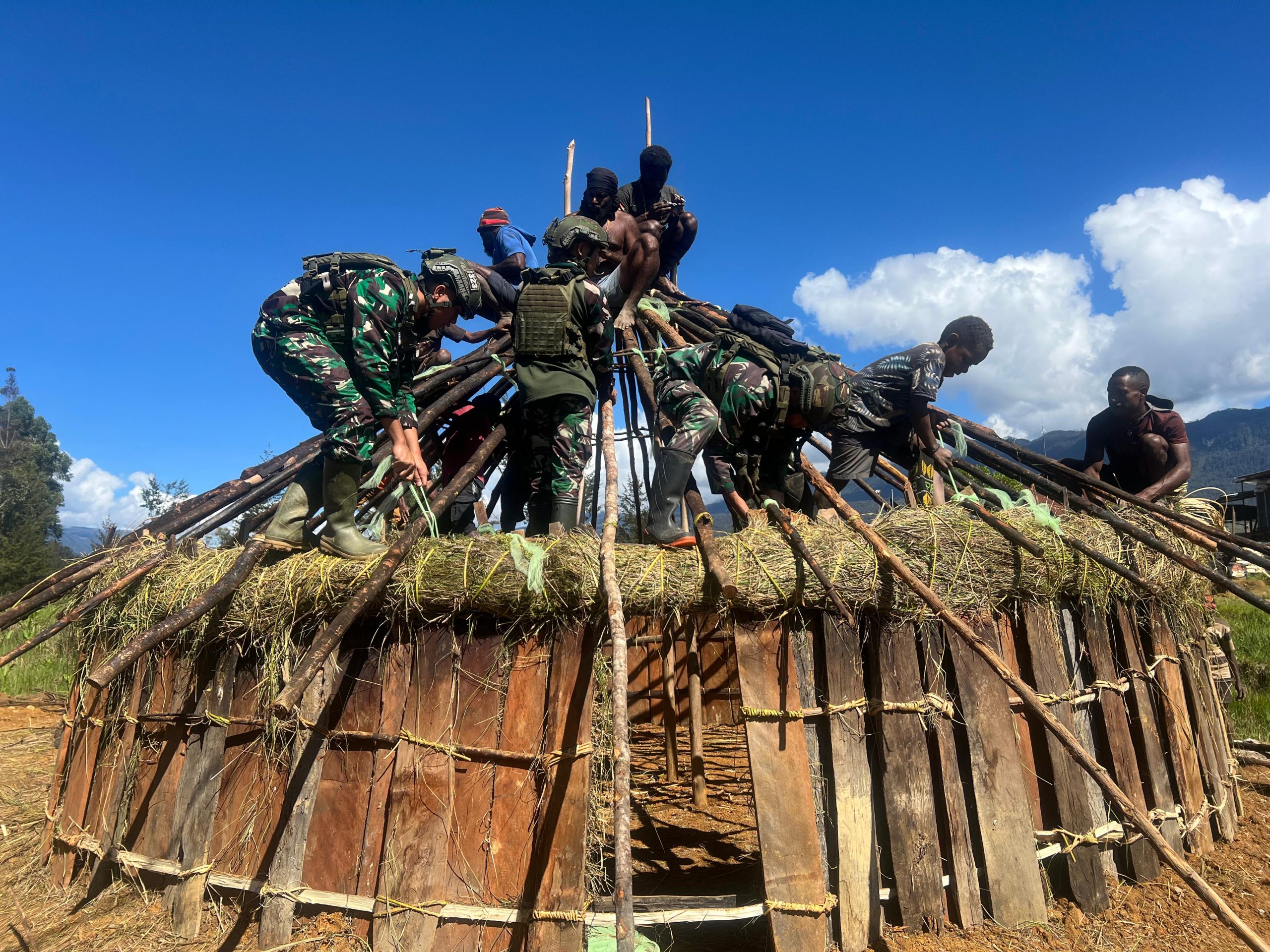 Potret kebersamaan warga dengan Prajurit TNI dalam gotong royong pembuatan Honai tersebut menggambarkan bahwa kebersamaan masih tertanam dalam budaya dan menjadi tradisi masyarakat Papua, mulai dari proses penyiapan kayu, penyiapan jerami, pemasangan kerangka Honai dan pemasangan jerami sebagai atap. Merespons pembangunan Honai secara gotong royong, Bapak Emrin dengan antusias menyampaikan terima kasih atas kepedulian Prajurit TNI.