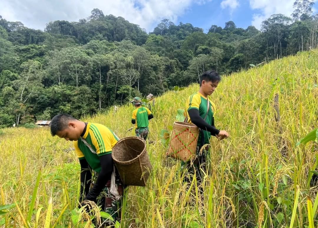 Nunukan – Satgas Pamtas Yonarmed 11 Kostrad Pos Lumbis bersama warga Desa Duyan Kec Lumbis Hulu Kab Nunukan melaksanakan panen padi gunung secara gotong royong di Sentra Ketahanan Pangan desa binaan Pos Lumbis. Kegiatan ini bertujuan untuk memperkuat kemanunggalan TNI-Rakyat serta mendukung ketahanan pangan di wilayah perbatasan. Selasa (25/2/ 2025).