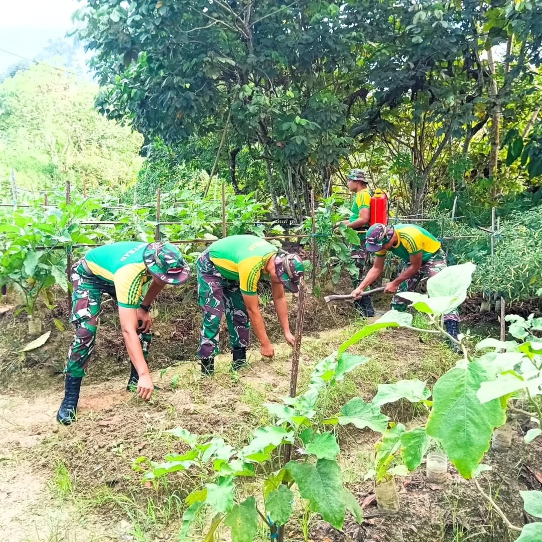 Nunukan – Satgas Pamtas Yonarmed 11 Kostrad Pos Gabma Simanggaris terus menunjukkan komitmennya dalam mendukung program ketahanan pangan melalui perawatan tanaman berupa pemupukan dan panen hasil kebun yang dikelola di lahan pos, tepatnya di Desa Sekaduyan Taka, Kecamatan Sei Manggaris, Kabupaten Nunukan. Sabtu (24/5/2025).