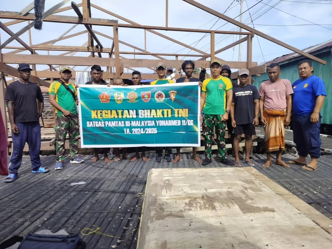 Nunukan – Satgas Pamtas Yonarmed 11 Kostrad Pos Sei Kaca kembali menunjukkan kepeduliannya terhadap masyarakat di perbatasan dengan menggelar kegiatan karya bhakti membantu pembangunan rumah milik Bapak Dedi di Kampung Pukat, Desa Sei Bolong, Kecamatan Nunukan Barat, Kabupaten Nunukan. Sabtu (01/2/2025).