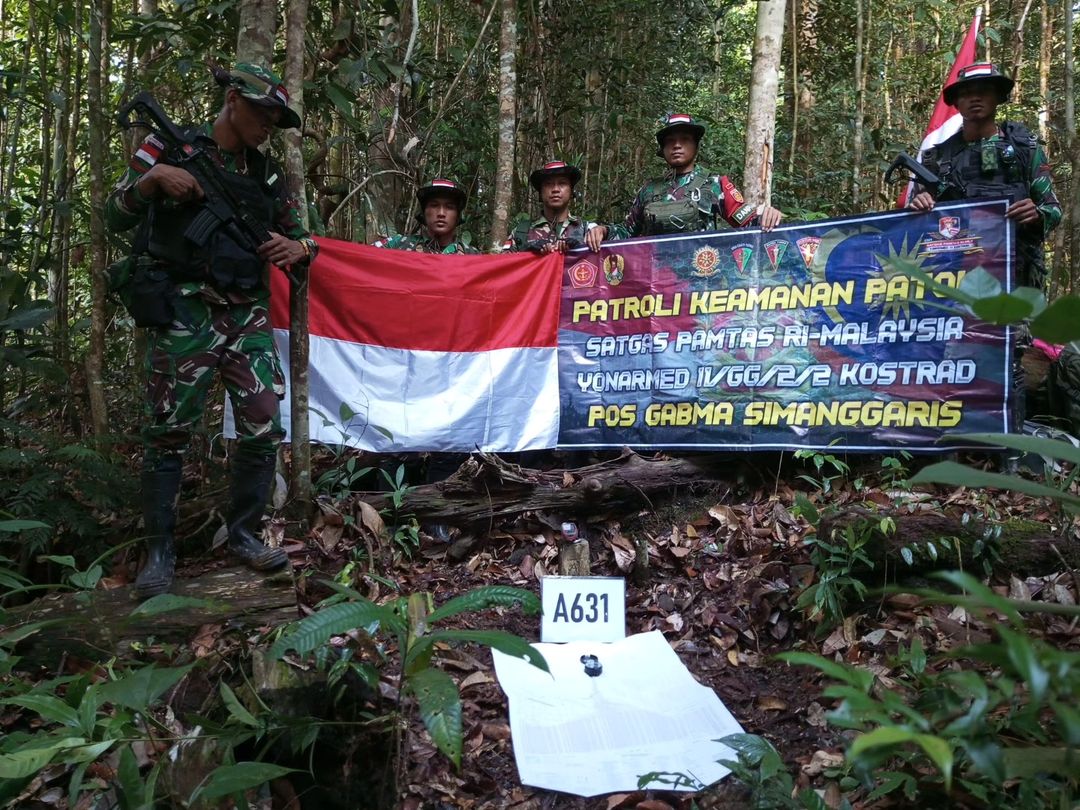 Satuan Tugas Pengamanan Perbatasan Yonarmed 11 Kostrad Pos Gabma Simanggaris melaksanakan patroli patok untuk memastikan tidak ada pelanggaran batas wilayah serta menjaga kedaulatan Negara Kesatuan Republik Indonesia di sepanjang perbatasan kedua negara. Senin (07/10/2024).