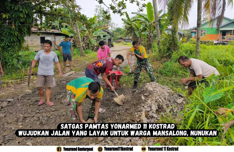 Nunukan – Satuan Tugas Pengamanan Perbatasan (Satgas Pamtas) Yonarmed 11 Kostrad Pos Simantipal menunjukkan dedikasi dan semangat pengabdian kepada masyarakat perbatasan dengan melaksanakan kegiatan karya bakti memperbaiki jalan di Desa Mansalong, Kecamatan Lumbis Induk, Kabupaten Nunukan, Kalimantan Utara. Selasa (28/7/2025).