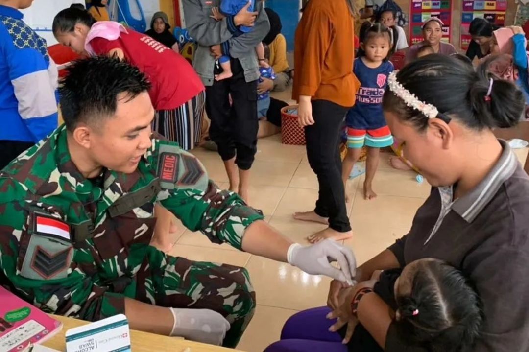 Personel Pos Koki 1 Mentari Bakes Satgas Pamtas RI-Malaysia Yonarmed 10 Kostrad Serka Muhammad Nur Eka selaku Bakes Kompi 1 membantu para tenaga kesehatan Puskesmas Desa Tinting Seligi dalam kegiatan bakti kesehatan Pos Pelayanan Terpadu (Posyandu) sebagai bentuk kepedulian terhadap kesehatan masyarakat di wilayah perbatasan.