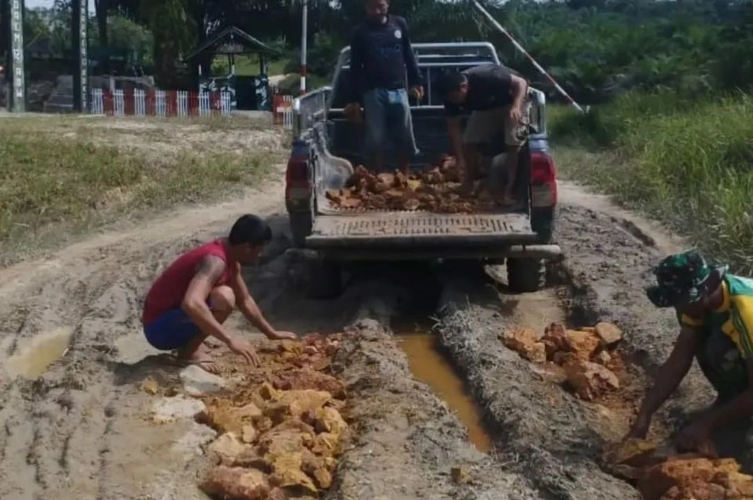 Oleh karena itu, Satgas Pamtas bersama masyarakat bersepakat untuk bergotong royong melakukan perbaikan jalan dengan penimbunan.