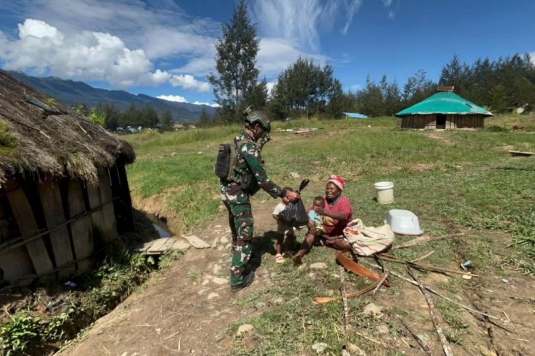 Dalam rangka merayakan HUT ke-79 TNI, Pos Kotis Satgas Pamtas Mobile Yonif 323 Buaya Putih memberikan bantuan paket sembako kepada Tokoh Agama dan Masyarakat di Kampung Kago Distrik Ilaga, Kabupaten Puncak, Papua Tengah, Rabu (02/10/2024)