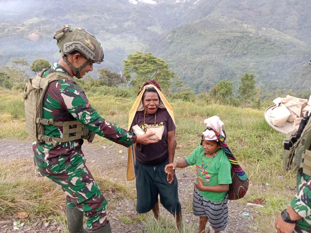 Satgas Mobile Yonif 323/Buaya Putih yang bertugas di wilayah pedalaman Papua Tengah melaksanakan kegiatan Jum’at Berkah dengan berbagi makanan di Kampung Wombru, Distrik Megeabume, Kabupaten Puncak, Papua Tengah, pada Sabtu (09/11/2024).