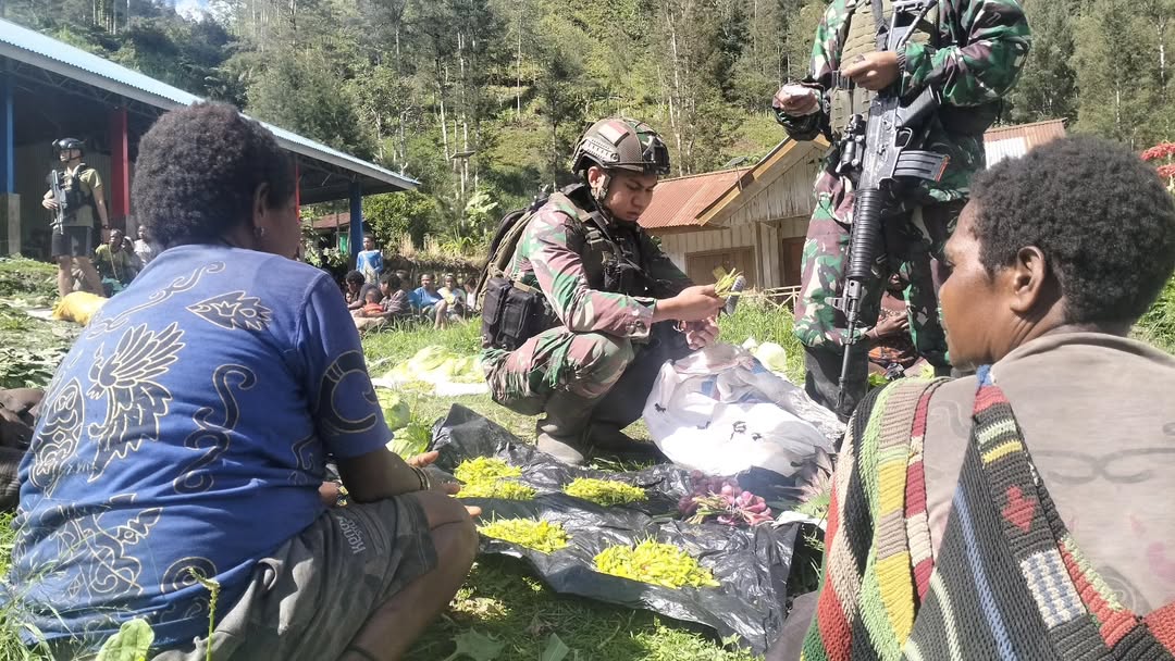 Beoga – Prajurit Titik Kuat Beoga Satgas Pamtas RI-PNG Mobile Yonif 323 Kostrad yang dipimpin Lettu Inf Ari Surahman membantu menggerakkan roda perekonomian warga Distrik Beoga dengan memborong hasil bumi yang dijual di Pasar Milawak, Beoga, Kabupaten Puncak. Selasa (26/11/2024).