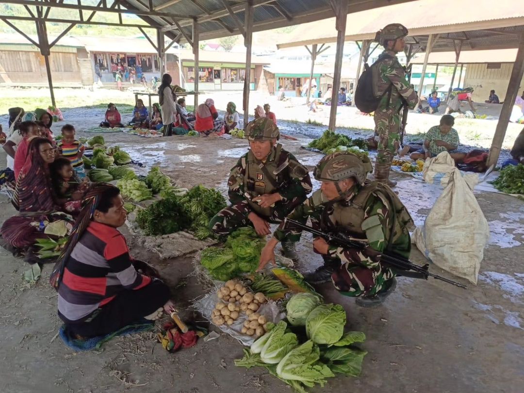 Satgas Yonif 323 Buaya Putih melaksanakan Program ROSITA (Borong Hasil Tani) di Pasar Sinak, Kampung Gigobak, Kabupaten Puncak, Papua Tengah, Kamis (21/11/2024).