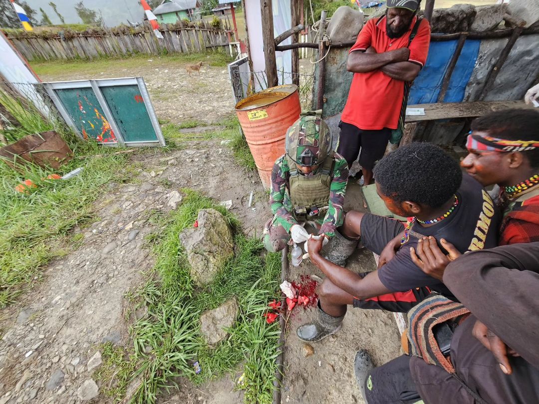 Satgas Mobile Yonif 323 Buaya Putih melakukan pertolongan pertama bagi masyarakat yang terluka akibat terkena sabetan parang di kampung Mayuberi, Distrik Ilaga, Kab.Puncak, Papua Tengah, Selasa (15/10/2024).