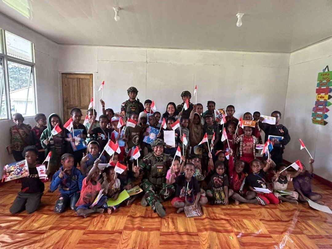 Satgas Mobile Yonif 323 Buaya Putih Peduli Pendidikan Anak Papua melalui TK Kosatgas Pimpinan Pasiter Satgas Letda Chk Dani dengan Membantu Mengajar dan Memberikan Bantuan Alat musik untuk Sekolah SD Swasta Pemulihan Cartenz Puncak, Distrik Ilaga, Kabupaten Puncak, Papua Tengah, Kamis (26/09/24)
