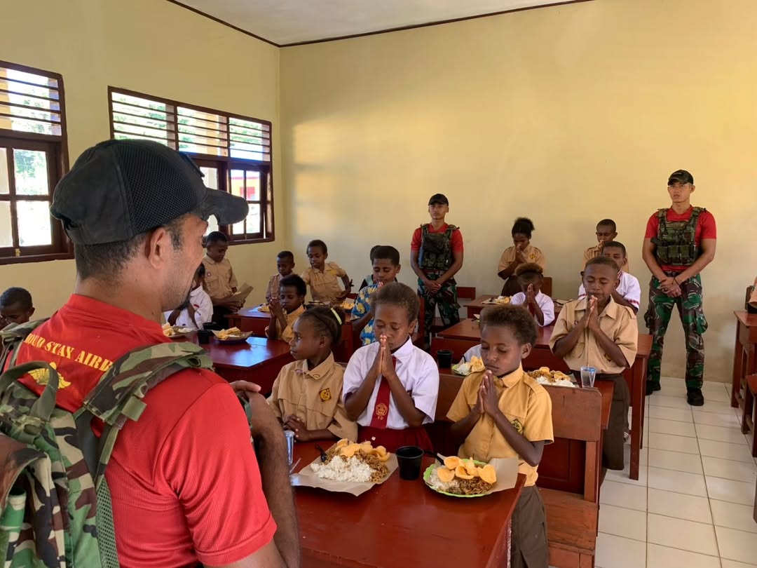 Satgas Yonif 501 Kostrad Bagikan Makan Siang Gratis, Anak-Anak SD di Maybrat Ceria