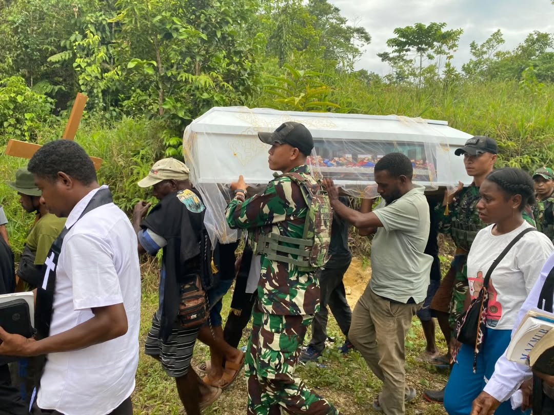 Kampung Fanakario – Satgas Yonif 501 Kostrad menunjukkan kepeduliannya dengan menghadiri pemakaman salah satu warga Kampung Fanakario yang meninggal dunia. Kehadiran prajurit TNI dalam acara ini menjadi bukti eratnya hubungan antara Satgas dan masyarakat setempat, serta wujud solidaritas di luar tugas militer. Rabu ( 12/2/ 2025).