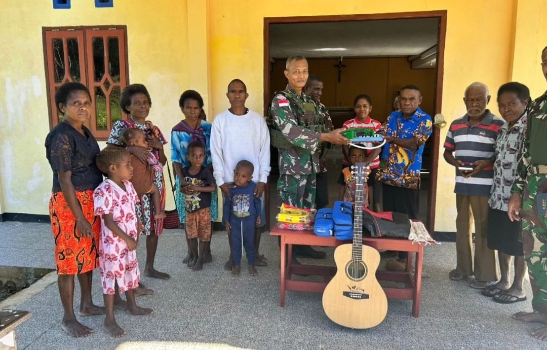 Satgas Pamtas Mobile Yonif 501/BY menyalurkan bantuan alat musik kepada masyarakat di Distrik Aifat, Kabupaten Maybrat, Papua Barat, pada Rabu (09/10/2024).
