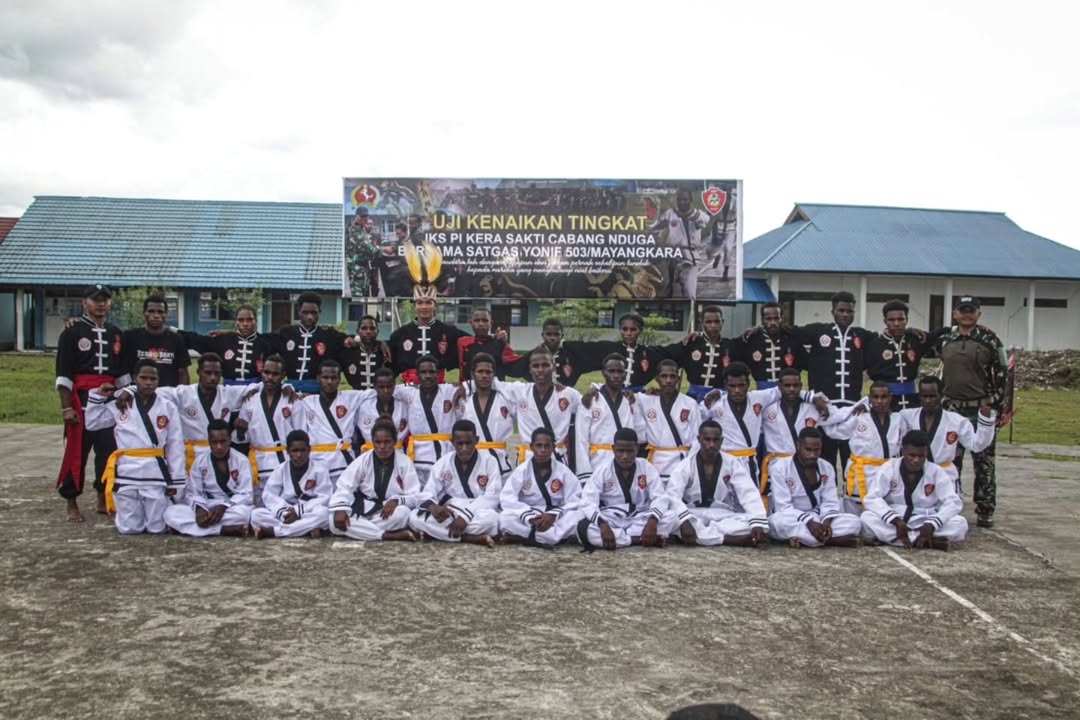 Satgas Pamtas Mobile RI-PNG Yonif 503 Kostrad ikut serta dalam uji kenaikan tingkat beladiri IKS PI Kera Sakti Pasker Nduga di Distrik Kenyam, Kabupaten Nduga Papua Pegunungan. Sabtu (01/02/2025).