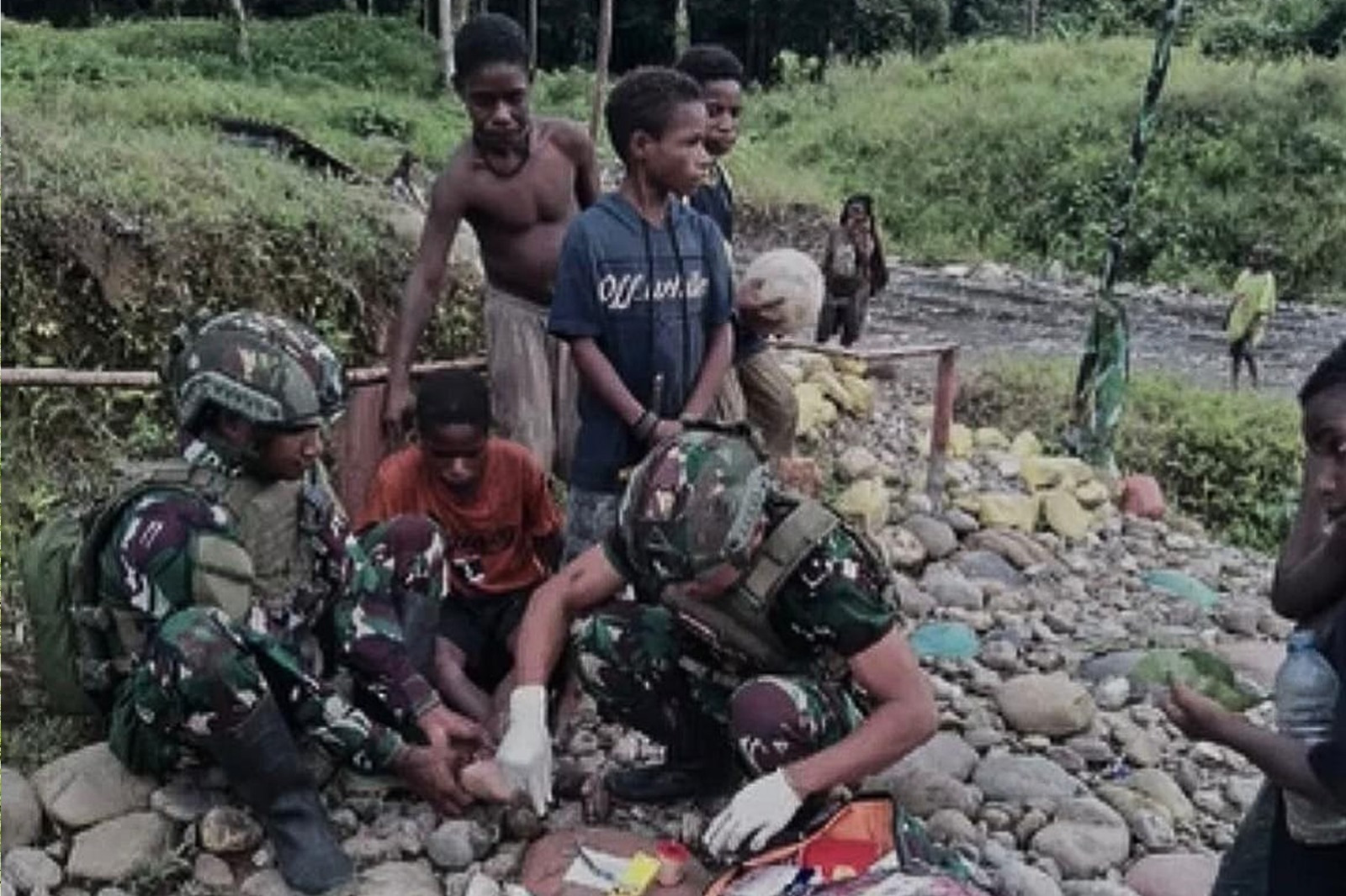 MetropolitanPost.id – Satgas Pamtas Mobile RI-PNG Yonif 503/Mayangkara Koops Habema berikan pertolongan pertama pada anak – anak yang mengalami kecelakaan pada saat main bola di Desa Quary Bawah Kabupaten Nduga Papua. Minggu (11/08/2024).