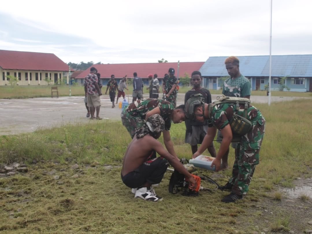 Satgas Pamtas Mobile RI-PNG Yonif 503 Kostrad bersama remaja aktifis sekolah babat rumput halaman sekolah hingga bersih, di SMPN 1 Kenyam Kabupaten Nduga Papua. Kamis (12/12/2024).