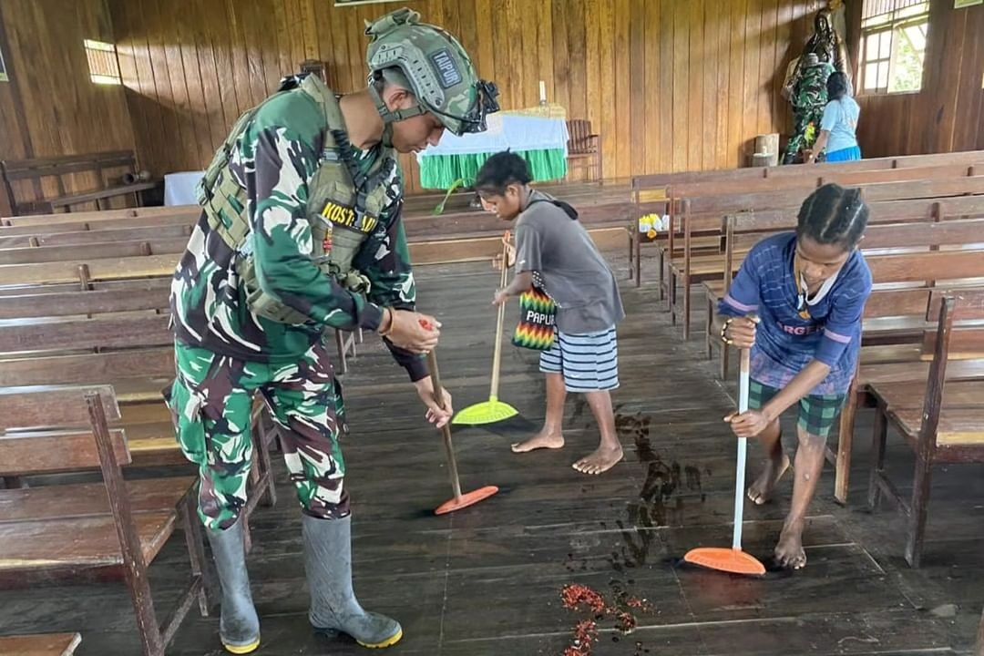 MetropolitanPost.id – Satgas Yonif 503 Kostrad bersama sama dengan masyarakat Desa Mumugu Distrik Krepkuri Kabupaten Nduga melaksanakan pembersihan gereja Quasi Paroki Santo Damian. Senin (19/08/2024).