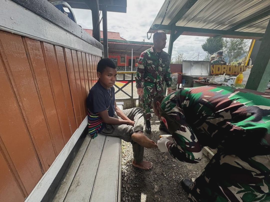 Intan Jaya — Prajurit Satgas Yonif 509 Kostrad di Titik Kuat Mamba memberikan pengobatan kepada seorang anak yang terluka di kakinya akibat jatuh saat bermain, Sabtu (23/11/2024).