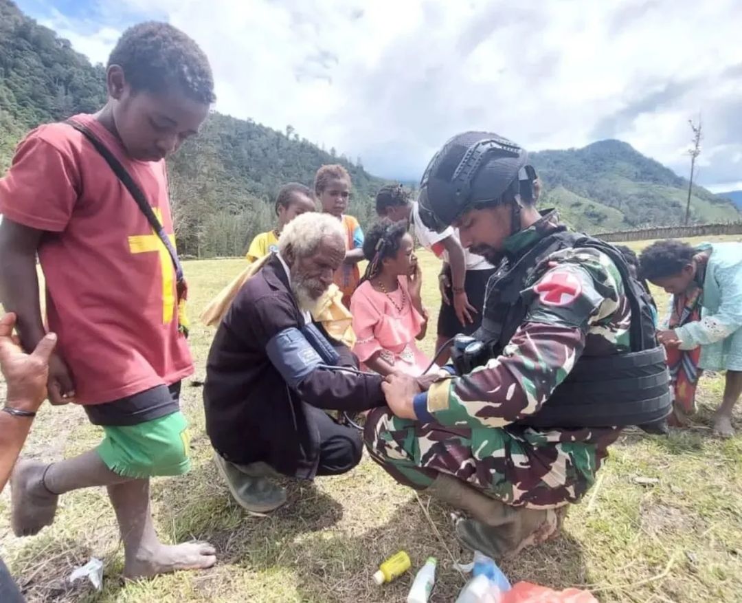 Satgas Satuan Organik Yonif R 303/SSM Divif 1 Kistrad memberikan pelayanan pengobatan massal kesehatan secara gratis untuk warga perbatasan di Kampung Mayuberi , Distrik Ilaga Utara kabupaten, Puncak Papua, Selasa (10/1/2023).