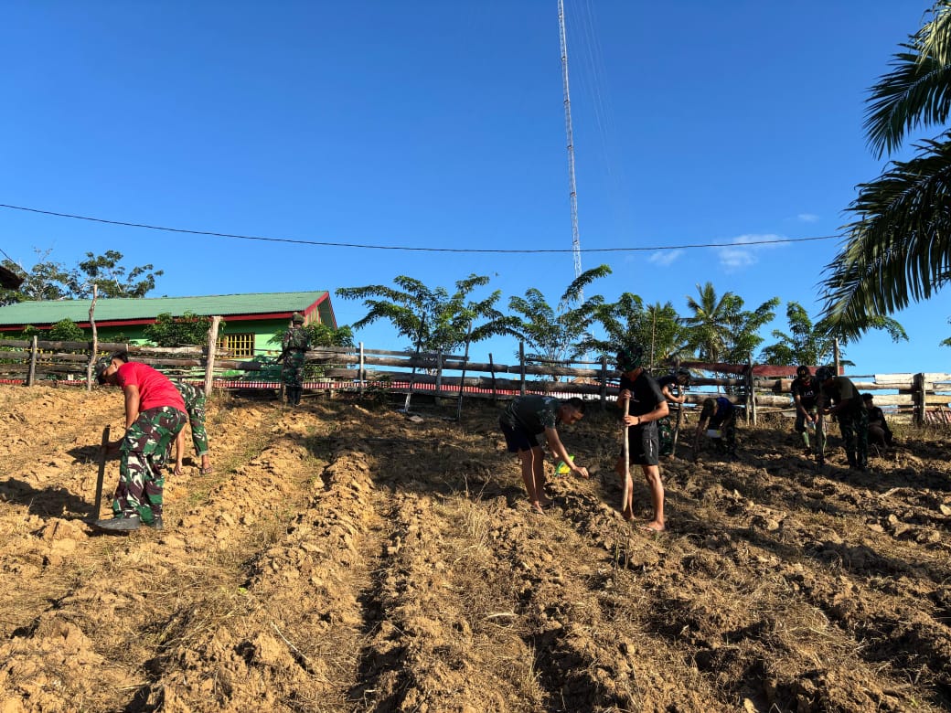Distrik Venaha, Papua Selatan — Dalam rangka mendukung ketahanan pangan Nasional dan meningkatkan kesejahteraan masyarakat Papua, Satgas Pamtas RI-PNG Yonif 141/AYJP Pos Venaha melaksanakan program penanaman jagung di lahan 1,5 hektar, Sabtu 05 April 2025.