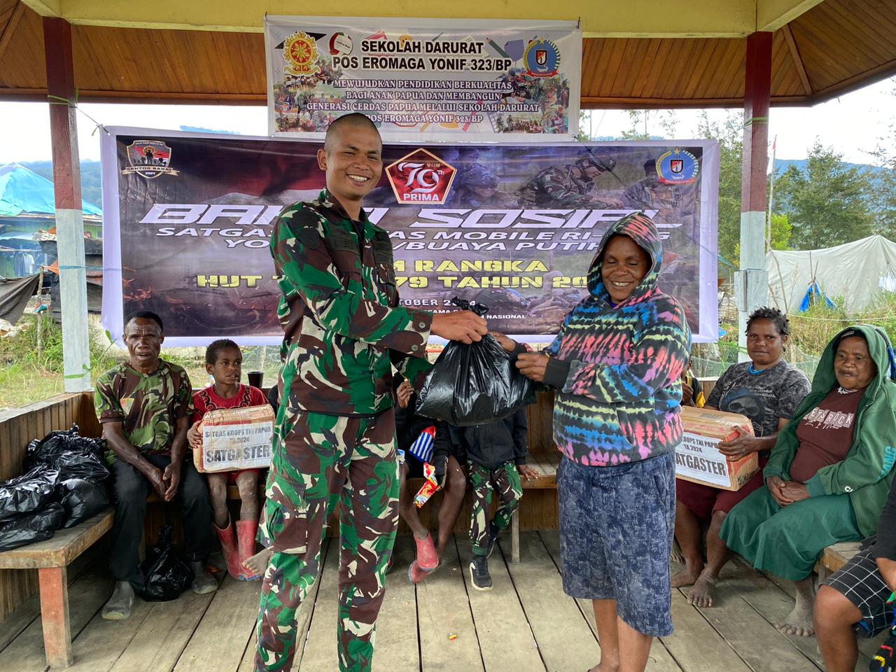 Pada hari Kamis, (3/10/2024), Satgas Yonif 323 Kostrad, khususnya Pos Eromaga pimpinan Lettu Inf Anggun, mewujudkan kepedulian sosial melalui pemberian Paket Sembako kepada warga Kampung Eromaga, Distrik Omukia, dalam rangka memperingati Hari Ulang Tahun ke-79 TNI.
