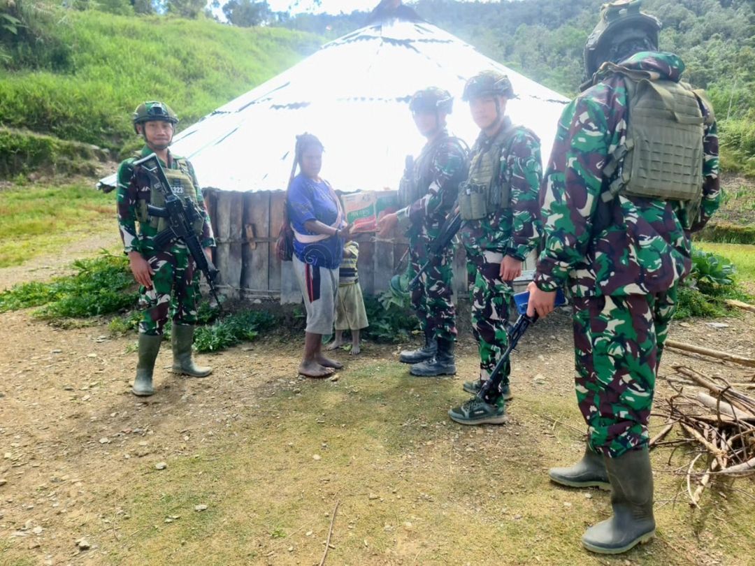Dalam rangka memperingati HUT ke-79 TNI, Personel Titik Kuat Pintu Jawa Satgas Pamtas Mobile RI-PNG Yonif 323/Buaya Putih berbagi mie instan dan permen kepada masyarakat papua, Kp. Womburu, Distrik Mage’abume, Kab. Puncak, Papua, Jumat (4/10/2024).